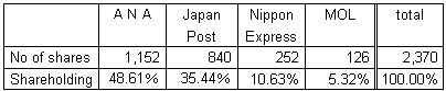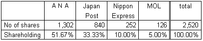 TOKYO April 27, 2006 - ANA & JP Express (AJV), a new joint-venture cargo airline, announced today that investment by All Nippon Airways (ANA), Japan Post, Nippon Express and Mitsui O.S.K. Lines (MOL)was completed and shares allotted at an extraordinary shareholders meeting convened on April 25, 2006. |