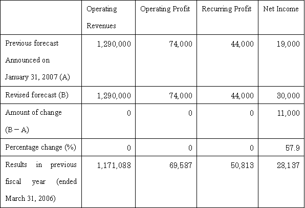 TOKYO April 16, 2007 - On April 13, ANA concluded an agreement for the transfer of the shares and assets of hotel-related subsidiaries. Following consultations with its independent auditors, ANA recorded a reversal to extraordinary gain of the allowance for bad debt related to those subsidiaries (about 7.0 billion yen) and applied tax effect accounting principles to the valuation loss on the transferred shares (about 4.0 billion yen). As a result, ANA has revised its non-consolidated performance forecast for the fiscal year ended March 31, 2007, as indicated below. The consolidated performance forecast is currently being reconsidered, and a notice will be provided when those figures are determined. 1. Revision of non-consolidated performance forecastNon-consolidated performance forecast for the fiscal year ended March 31, 2007 (April 1, 2006, to March 31, 2007) |