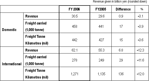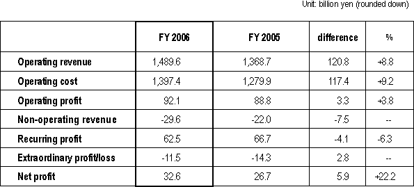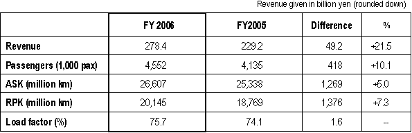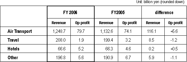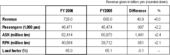 TOKYO April 27, 2007 - ANA Group today posted a record consolidated operating profit of ¥92.1billion on a record consolidated revenue of ¥1.48 trillion for the twelve months ended March 31, 2007. This represents a year-on-year improvement of 3.8% and 8.8% respectively. Consolidated net profit for the period was ¥32.6 billion, the second highest in ANA’s history and 22.2% better than the FY2005. The Group’s highest net profit was posted in FY 2000. Costs incurred by the return of leased aircraft resulted in a 6.3% drop in recurring profit to ¥62.5 billion. “We have seen strong demand for both business and leisure travel in tandem with the performance of the Japanese economy as whole,” said Mineo Yamamoto, President and CEO of ANA. “Coupled with improvements to our network, more flights and new fares, these have contributed to the excellent results announced today”. “However, profit has been squeezed by a fuel bill that is 31.3% higher than last year. We will keep doing our best to tackle rising costs, and thank our customers, who have had to share part of that burden, for their loyalty,” he continued. Air Transportation Segment Domestic Passenger Services All in all, the number of passengers carried on domestic routes increased 2.2%, despite 2006 being a year with no specific events to stimulate demand, such as the previous year’s Aiichi World Expo, which buoyed up the number of passengers travelling on domestic services in 2005. International Passenger Services Strong demand for business travel continued unabated throughout FY2006. In addition, leisure travel demand grew strongly, stimulated by marketing campaigns for the Ecowari promotional fare and for destinations in China. The addition of Chicago to ANA’s North America network, more flights to Singapore and China, and the down-gauging of aircraft to better match demand on flights between Osaka (Kansai) Qingdao and Xiamen in China, contributed to the successful result in terms of revenue and passenger numbers. Travel to, from and via Narita Airport was significantly improved by the move to new facilities in the South Wing of Terminal 1, together with ANA’s fellow Star Alliance member carriers. Not only were connecting times shortened, but the whole experience was made more convenient and simple by the introduction of shared facilities, including new lounges, and common use self service kiosks equipped with ANA’s Smart e-Service, which allow passengers to collect their boarding pass in a matter of seconds. Cargo On domestic routes, increased economic activity spurring demand and an increase in the number of late night cargo flights contributed to a 3.1% increase in revenue and a 3.6% increase in Revenue Tonne Kilometres (RTK) flown. International cargo services performed particularly well with increases in loads, revenue and RTKs in excess of 10% respectively. This strong performance can be attributed to increased flights to North America, China and the rest of Asia. Forecast for FY2007 The posting of an extraordinary profit on the sale of ANA’s hotel holdings is expected to boost consolidated net profit to record levels, despite a forecast extraordinary loss on the accelerated retirement of aircraft to renew the fleet. The price of fuel is expected to continue at an elevated level, exerting strong downward pressure on consolidated operating profit and recurring profit. For the first time since FY 1992, ANA is expecting to pay a dividend of ¥5 per share. For details, please refer to the charts below. |
