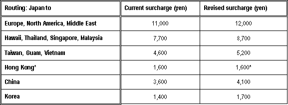 | * No adjustment will be made to the fuel surcharge for Hong Kong, even though it falls within the same distance bracket as Taiwan, Guam and Vietnam, for reasons of government approval. An application to revise the surcharge on this route may be made at a later date. | |||||||||