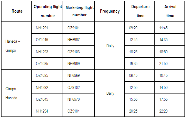 TOKYO October 11, 2007 - ANA and Asiana will extend their code-sharing agreement to include the Tokyo Haneda - Seoul Gimpo route, linking the two airports closest to their respective capital city centres, from October 28 this year. Both Haneda and Gimpo airports and can be accessed easily and conveniently from the centres of the cities they serve. As the two daily ANA operated return flights will carry the Asiana two-letter code, OZ, and the two daily Asiana operated return flights will carry the ANA two-letter code, NH, customers will be given greater freedom and more convenience in their choice of flights between Tokyo and Seoul. ANA and Asiana first entered a code-sharing agreement for passenger flights in 2000. Once these code-share flights commence, it will cover all 19 routes between Japan and Korea operated by these two Star Alliance member airlines - 185 weekly flights in total (as of October 28, 2007; rising to 197 flights during the winter schedule). In addition to passenger flights, the agreement was expanded in 2006 to include all freighter flights operated by the two carriers between the two countries. Also from October 28, in a further move demonstrating the depth of their co-operation, and building on the strategic alliance that ANA and Asiana announced in December last year, customers will be served in the cabin by crew of both airlines on the same flight. |