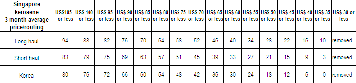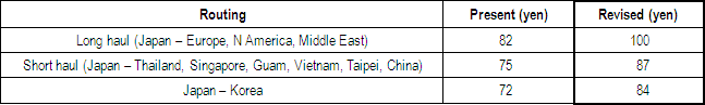 TOKYO February 26, 2008 - ANA today applied to Japan’s Ministry of Land, Infrastructure and Transport to revise upwards its surcharge on international cargo shipments from April 1, 2008. Since October last year ANA has fixed its fuel surcharge for a three month period, with any revision based on the average price of jet fuel for the three months immediately preceding the time of the application. For the three month period from November 2007 to January 2008, Singapore kerosene - as reported by the US Department of Energy - averaged US$109.06 per barrel; currently it remains at a historical high of over US$110 per barrel. ANA continues to strive to curb costs and secure greater operating efficiencies, however it regrets that it must ask its valued customers to once again share the increased cost burden. |