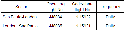 TOKYO/SAO PAULO, September 21, 2010 - ANA and TAM Airlines announced today that the two Star Alliance carriers will strengthen their relationship through a new code-sharing agreement beginning October 15, 2010, which is subject to government approval. Both carriers will cooperate through code sharing to connect Tokyo and Sao Paulo via London. TAM Airlines will place its JJ flight code on ANA flights between Narita, Tokyo and Heathrow, London. ANA will place its NH flight code on TAM flights between Heathrow, London and Guarulhos, Sao Paulo. The code sharing will increase both airlines’ presence in each other’s market, as well as provide seamless travel to their customers to various cities in Asia and South America via Tokyo and Sao Paulo, respectively. Since May 2010, members of both airlines’ frequent flyer programs, “ANA Mileage Club” and “TAM Fidelidade”, have already begun to accrue and redeem miles with either airline. “The cooperation with TAM Airlines will enable us to connect Sao Paulo, South America’s largest business market, and ANA’s major international hub in Tokyo, enhancing our position in the South American market. Through code-sharing service, both ANA and TAM Airlines will be able to offer their customers a greater opportunity to travel between Asia and South America,” said Keisuke Okada, ANA’s Executive Vice President, Alliances and International Affairs.