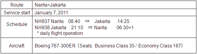 TOKYO, October 28, 2010 - ANA, Japan's leading carrier, today unveiled its new route schedule for services from Tokyo Narita to Jakarta. The route will be operated by new Boeing 767-300 ER aircraft, from January 7, 2011, offering business travelers unrivalled service with the “ANA BUSINESS CRADLE” seats. Under the new schedule, ANA's Jakarta service will depart Narita in the morning - Tokyo time - and will return from Jakarta the same evening.  * Schedule may change due to operational reasons