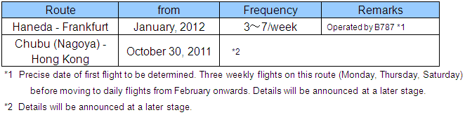 From January 2012, ANA will fly the Boeing 787 on a new night-time route between Haneda and Frankfurt as part of our joint venture with Lufthansa. ANA will also be improving and expanding its network with a new route between Chubu(Nagoya) and Hong Kong and changes aircraft type on the Narita - Xiamen/Guangzhou routes.