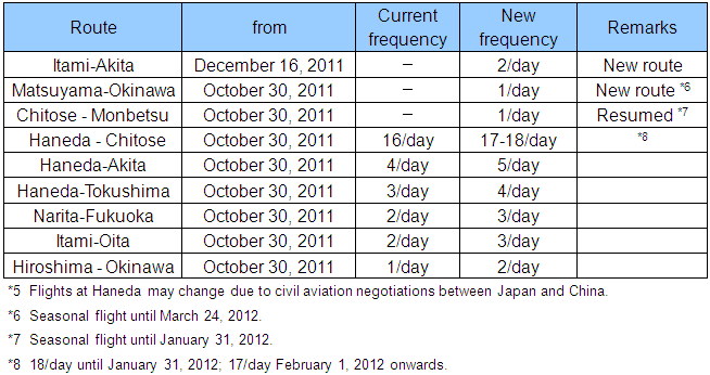 TOKYO August 23, 2011 - ANA Group today announced its revised flight schedule for the second half of fiscal year 2011. Although demand for air travel was severely affected by the Great East Japan Earthquake, it is now recovering gradually and ANA is looking to further expand its flight network with the introduction of the Boeing 787 Dreamliner, first deliveries of which begin in September. The changes to ANA’s flight schedule will involve the launch of a number of new domestic and international routes and the introduction of larger aircraft and increased frequencies on some city pairs. On a number of domestic routes, frequencies will be decreased to reflect demand. Details of the planned changes can be found below.