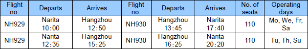 | ANA to start daily service on Narita‒Hangzhou route from January |
