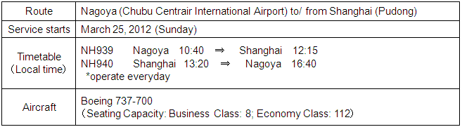 TOKYO January 10, 2012 - ANA, Japan’s leading carrier, today announced that it will resume services from Nagoya to Shanghai when its summer 2012 timetable begins on March 25 this year. The route will be operated by Boeing 737-700 aircraft, offering a convenient schedule for both business and leisure passengers, departing Nagoya in the morning and returning from Shanghai in the afternoon. Details of the service are as follows (subject to approval by relevant authorities): |