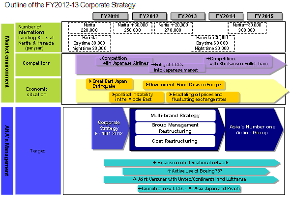 The above plan is designed to strengthen ANA against a backdrop of global economic uncertainty, the ongoing sovereign debt crisis in the Eurozone, high oil prices and fluctuating foreign exchange rates and position it to become Asia’s Number One airline in the face of increased competition from a new wave of Low Cost Carriers, other carriers in the region and other modes of transport. At the same time, the management plan will enable ANA to take advantage of the expansion of airport capacity in Metropolitan Tokyo, its role as launch customer for the Boeing 787 Dreamliner and the joint ventures with partner airlines.