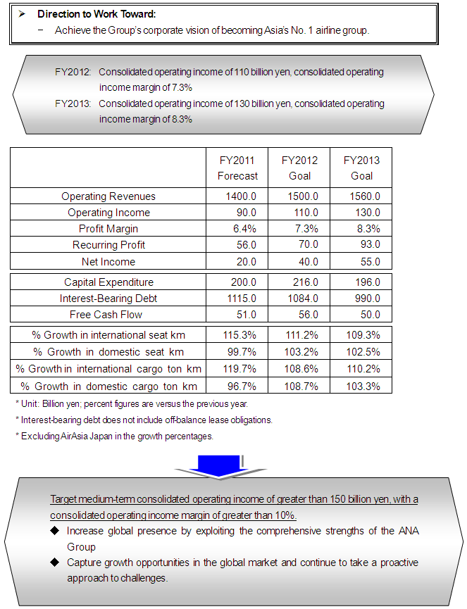 Strengthening Cost Competitiveness through Structural Reforms In addition to the structural reforms enacted in FY2011, the Group will introduce further measures to reduce costs by 100 billion yen (equivalent to an approximate 1.0 yen reduction in unit costs) by FY2014.  Becoming the No 1 brand in Asia through superior service and performance ANA’s mainline full-service airline will provide products and services clearly distinguished from the LCCs, built on best-in-class customer service and human resources with the goal of becoming Asia’s No. 1 airline in quality and customer satisfaction. Under the brand concept “Inspiration of Japan”, we will work to acquire five-star airline rating from Skytrax. We will prioritize punctuality and make continuing efforts to remain No.1 for “On-time Performance’ in the Flight Stats Awards*. *Flight Stats is the main product of the U.S. firm. Conducive Technology. Management and Financial Goals  |