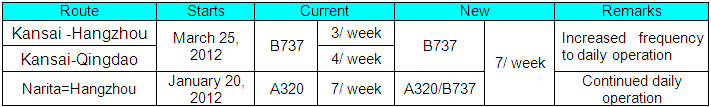 TOKYO March 6, 2012- ANA, Japans largest airline, today announces that it will increase the frequency of flights on its routes from Kansai (Osaka) to Hangzhou and Qingdao in China to meet growing market demand. Currently, ANA flies three times a week between Kansai and Hangzhou and four times a week between Kansai and Qingdao in Boeing 737 aircraft. From March 25, ANA will begin serving these two routes daily. ANA is also continuing to operate a daily service on the Narita (Tokyo)-Hangzhou route. This expansion in flights means that all ANA routes between Japan and China will be operated on a daily basis from March 25.