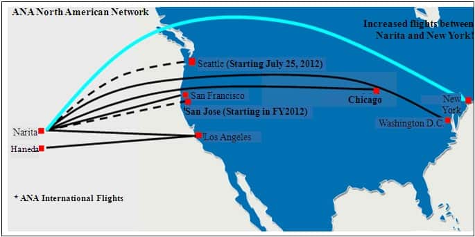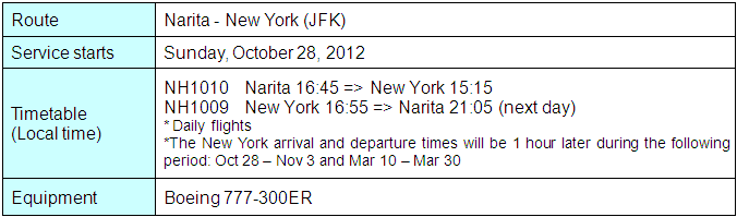 TOKYO July 24, 2012 - ANA Group, Japans largest Airline Group, today announces that it will increase the number of flights it operates between Narita and New York (JFK), from 7 flights a week to 14. This change, which will allow ANA to capitalize on the growth in demand for connections between Asia and North America, will come into effect from Sunday, October 28, 2012. The increase in flights to New York reflects ANAs strategy to accelerate the expansion of its international network, which is a key pillar of its FY2012-13 Corporate Strategy. It also further strengthens ANAs business model as a network carrier focusing on both long distance demand and demand for connections. Looking ahead, ANA intends to focus on the increased demand for connections between Asia and North America, and not exclusively those routes between Japan and Asia/North America. This announcement follows the recent news that ANA will open two new international routes in Fiscal 2012, between Tokyos Narita Airport and Yangon, Myanmar (from October 15, 2012) and between Narita and Delhi, India (from October 28, 2012). ANA will begin accepting reservations and sales for the newly scheduled flights between Narita and New York from Wednesday, July 25, 2012. These flights are based on the approval of the relevant authorities.
