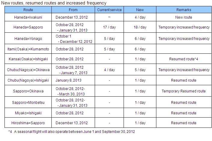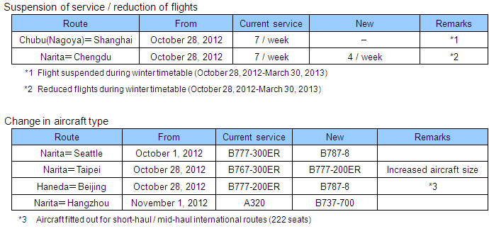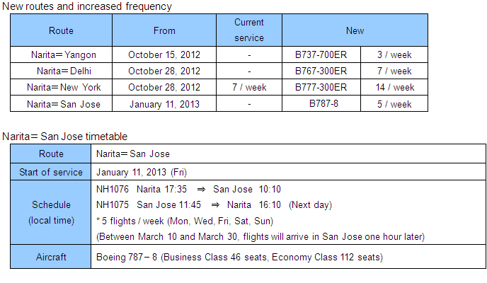 TOKYO August 21, 2012 - ANA Group, Japans largest airline group, today confirms its flight schedule for the second half of fiscal year 2012. The schedule reflects ANAs focus on strengthening its business model to capture demand for long-haul international flights and transit passengers in order to maximize its position as a network carrier. ANA plans to introduce the Boeing 787 on a wider range of international and domestic routes to improve competitiveness, while also aiming to optimize aircraft usage in accordance with supply and demand to achieve maximum efficiencies. Details are as follows. Schedules are subject to approval of the government authorities. Schedules may also be subject to change. International Routes In order to improve services between North America and the Asian continent using Narita Airport as a hub, ANA will be expanding its network during the second half of FY2012, with the introduction of new routes between Narita and the destinations of Yangon, New Delhi and San Jose in addition to more frequent flights between Narita and New York. ANA will also be making changes to flights from Japan to China and other destinations on the Asian continent through route optimization and aircraft type changes appropriate for the business environment on those routes.
