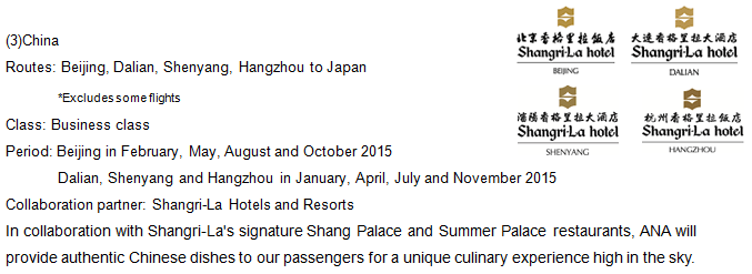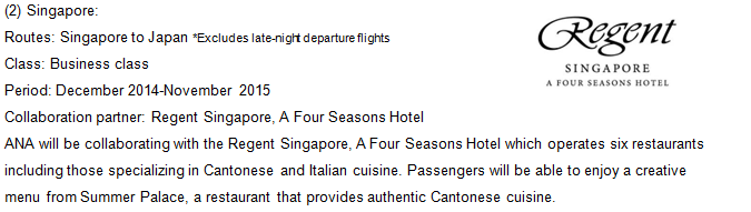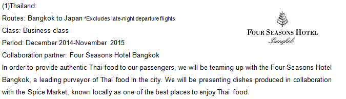 TOKYO, October 21, 2014 - From December 2014, ANA will be introducing in-flight meals created in collaboration with some of the world’s most highly acclaimed restaurants in Thailand, Singapore, China, Hong Kong and Los Angeles on flights from these countries to Japan. World class chefs from the Four Seasons, Shangri-La Hotels and Resorts, and the Patina Restaurant Group will work with ANA to create bespoke menus for passengers to enjoy on flights to Japan, providing passengers with more choice and variety. Passengers will be able to enjoy local cuisine from the country of departure, in addition to ANA’s traditional Japanese menu. For some international passengers, this may be their first taste of ANA’s in-flight cuisine, whilst for passengers returning home to Japan, these meals will be a deliciously fitting finale to a business trip or holiday.