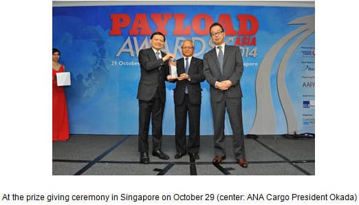 Tokyo, November 17, 2014 - ANA Group has been named “Combination Carrier of the Year (Customer Choice)” and “Main Deck Carrier of the Year (Customer Choice)” at the annual Payload Asia Awards held on October 29, 2014. The annual awards ceremony, hosted by the specialist air freight industry magazine Payload Asia, recognizes achievements in the air cargo industry, including airlines in Asia-Pacific and Middle East regions, airfreight forwarders and air cargo agents.