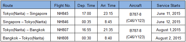 ANA will increase the number of flights from Tokyo to Singapore and Bangkok by introducing twice daily services from Narita to these two cities in addition to the existing double daily service from Haneda airport. Flights from Singapore and Bangkok arriving in Narita early morning will increase the number of North American cities that can be connected and will, together with the evening flight, greatly increase the convenience of Asia-North America connections at Narita.