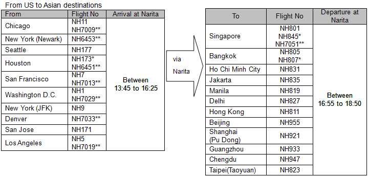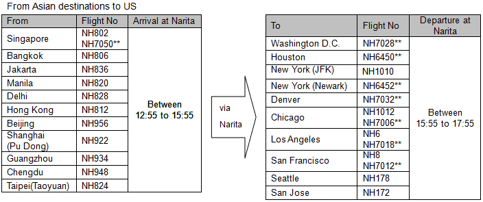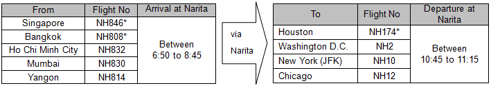 Possible connections between Asian cities and North America via Narita during the morning are shown as below.