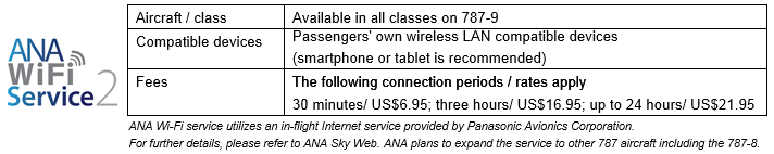 ANA’s new 787-9 aircraft for international service has a total of 215 seats, 46 more than the 787-8, and is equipped with the airline’s latest Business Class, Premium Economy and Economy Class amenities, providing passengers with a comfortable in-flight experience. New in-flight services offered on the aircraft include ANA SKY LIVE TV, a feature that allows passengers to view broadcast television programming in real-time, which is a first among Japanese airlines. In addition passengers aboard the new aircraft will have access to a choice of free digital content, including e-books and e-magazines, and an upgraded ANA Sky Map, which offers passengers a new multifunctional 3-D perspective to their flight path. ANA is also pleased to announce this will be the first 787 in its fleet to offer in-flight Wi-Fi service.