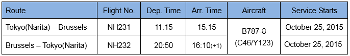 TOKYO, June 30, 2015 -ANA, Japan’s leading airline, is to launch its new service from Tokyo’s Narita Airport to Brussels on 25 October. This will be the first time ANA has flown to the Belgian capital and will make Brussels its sixth destination in Europe. The flight will be the only non-stop service from Japan to Belgium, playing an important role in ANA’s strategy to expand its international route network and enhance the airline’s brand awareness in Europe. ANA will operate a daily service in each direction using Boeing 787-8 Dreamliner aircraft. ANA aims to provide added convenience to passengers flying from Brussels Airport, with connections through its joint venture partners Lufthansa, Swiss International Airlines and Austrian Airlines, as well as Brussels Airlines, Star Alliance member. Beyond Europe, ANA serves 50 destinations throughout Japan, as well as 23 destinations across Asia. The travellers can explore ANA’s domestic destinations through its special discounted “Experience JAPAN Fare”. Osamu Shinobe, President and CEO of ANA, said: “As a major economic, commercial and political center Brussels is an increasingly important market for us. More and more passengers are flying between Tokyo and Brussels but they currently have to do so by transiting through other cities. By becoming the only Japanese airline to offer direct flights to the city, ANA will dramatically improve access for passengers to and from Japan. We look forward to inviting passengers on board and enabling them to experience ANA’s quality of service.”