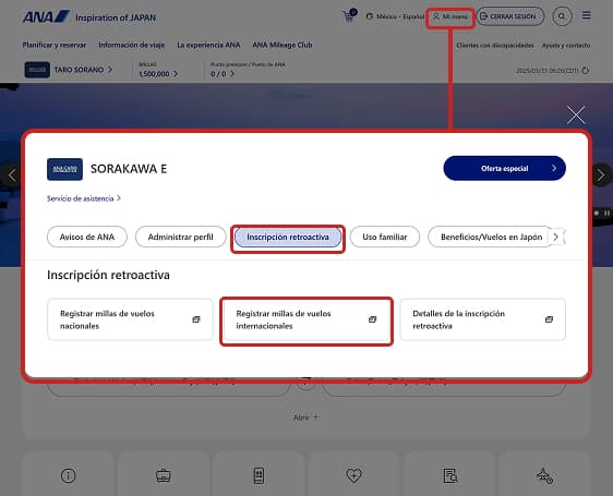 Seleccione “Inscripción retroactiva” en la sección Mi Menú y haga clic en “Registrar millas de vuelos internacionales”.