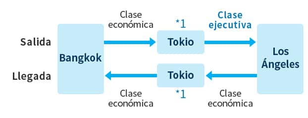 Para un itinerario con un viaje de salida (Bangkok a Tokio*1 a Los Ángeles) en clase ejecutiva y un viaje de retorno (Los Ángeles a Tokio*1 a Bangkok) en clase económica, las millas requeridas para cada clase se dividen entre dos y, luego, se suman.