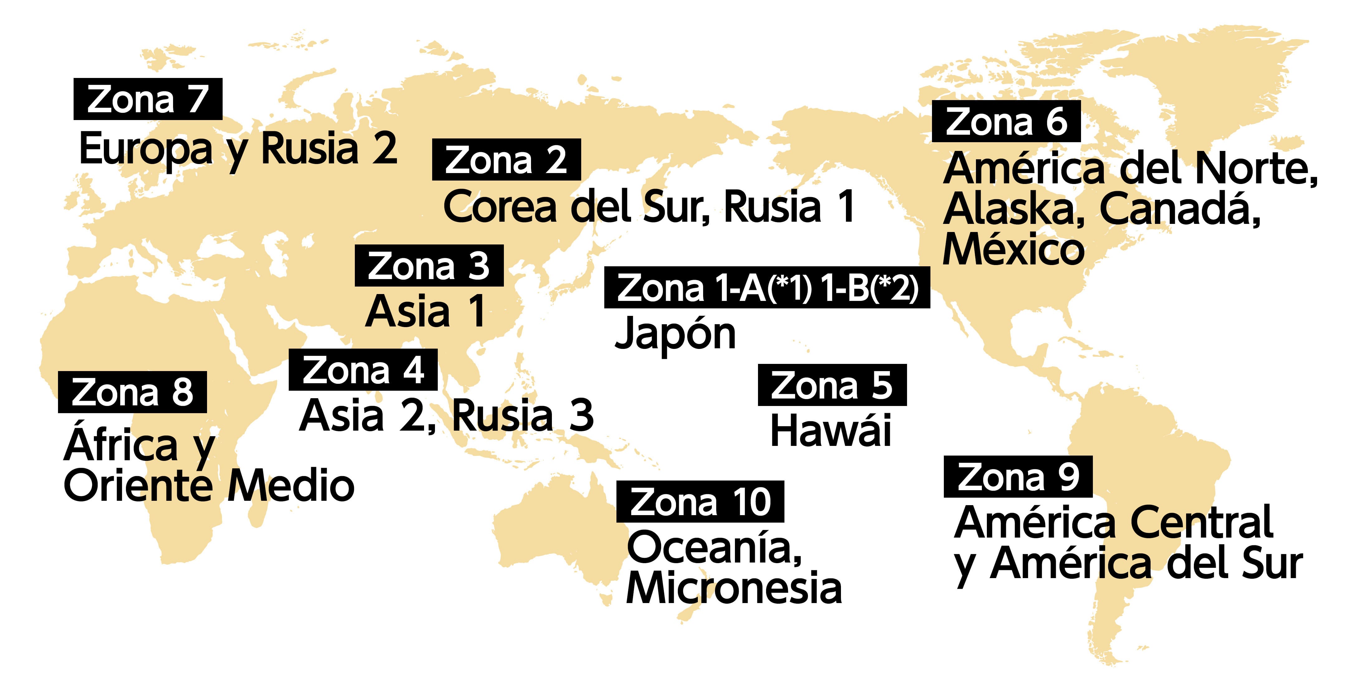 | Asia 1 (Zona 3) | Guam, Taiwán, China continental, Filipinas, Hong Kong, Macao |