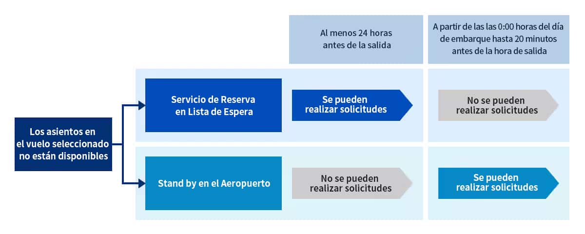 Si no quedan asientos en el vuelo de su preferencia, puede utilizar uno de los siguientes servicios para realizar una solicitud de lista de espera: Servicio de reserva en lista de espera (un servicio en línea) o modalidad Lista de espera en el aeropuerto.