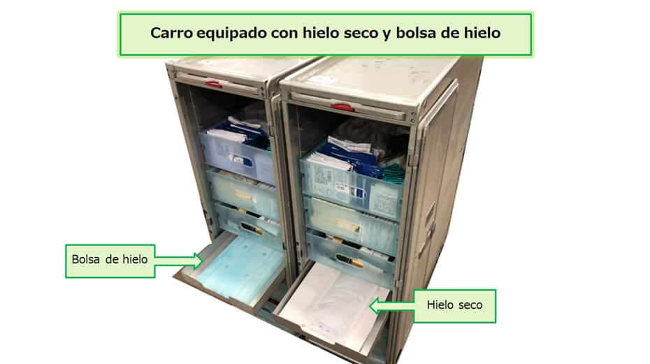 Además, el uso repetido de las bolsas de hielo dará como resultado una reducción anual de aproximadamente 30 toneladas en materiales para el empaquetado del hielo seco y las alfombras que se ubican debajo del hielo seco, y se espera que se reduzcan los costos totales en aproximadamente 200 millones de yenes al año (aproximadamente un 80 % de reducción), en comparación con el hielo seco. Además, si utilizamos bolsas de hielo, el personal de cátering y los tripulantes de cabina pueden concentrarse en su trabajo sin preocuparse de estar expuestos al hielo seco.
