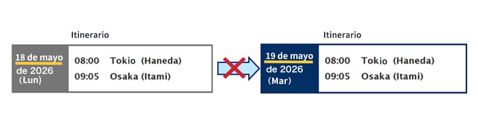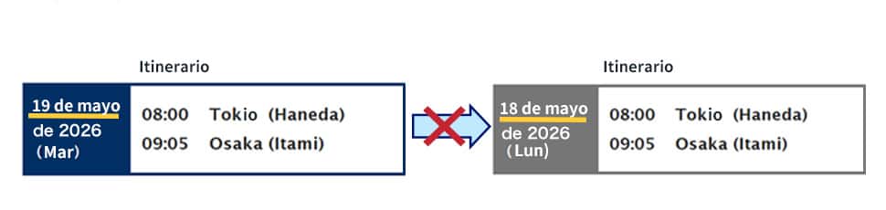 Debido a la renovación de las tarifas junto con la de nuestro sistema de servicio de pasajeros en vuelos nacionales en Japón, los vuelos con salida antes del 18 de mayo de 2026 y después del 19 de mayo de 2026 no se pueden incluir en una reserva. Por favor haga las reservas por separado.