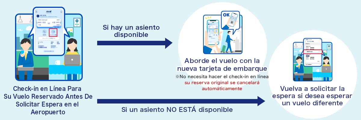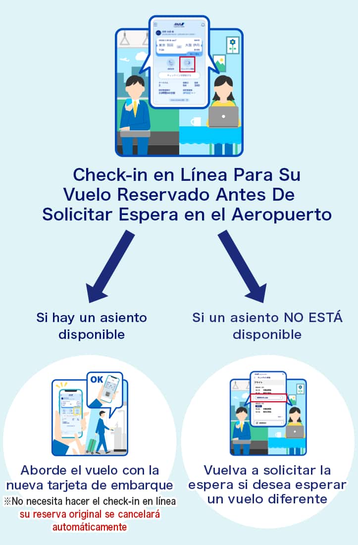 | Si los asientos están asignados | Si se asigna un asiento mediante una solicitud de lista de espera en el aeropuerto, su reserva original se cancelará automáticamente. * Si decide volar en el vuelo que había reservado, debe cancelar su solicitud de lista de espera a más tardar 20 minutos antes de la hora de salida del vuelo de lista de espera. Además, cuando haya un asiento disponible, se realizará el check-in automáticamente para el vuelo. |