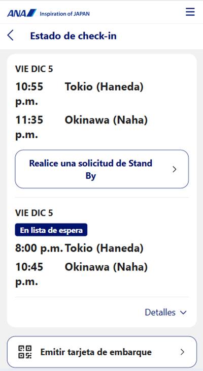 | Requisitos previos | Cuando realice una solicitud de lista de espera en la página web de ANA, debe hacer el check-in para su vuelo reservado. |