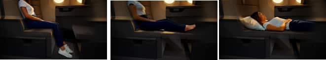 Además, los reposapiernas ajustables permiten convertir la configuración tipo sofá en una cama para crear un espacio personalizado adaptado a las preferencias de cada pasajero.