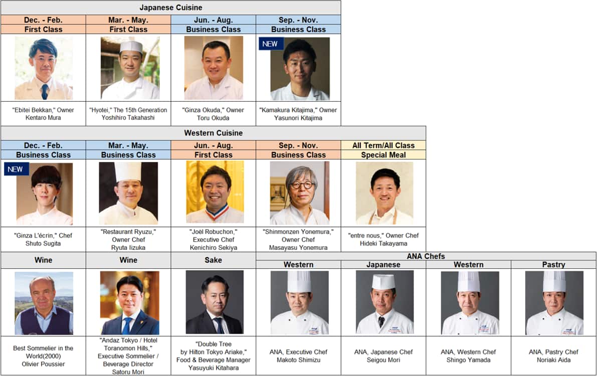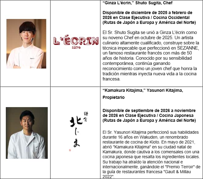 Los nuevos miembros, Shuto Sugita de Ginza L'écrin y Yasunori Kitajima de Kamakura Kitajima, crearán exclusivas propuestas japonesas y francesas para el servicio de comidas de Primera Clase y Clase Ejecutiva en rutas internacionales seleccionadas desde diciembre de 2025 hasta noviembre de 2026. Su incorporación mejora aún más el programa "THE CONNOISSEURS", que ANA lanzó en septiembre de 2013 para redefinir la experiencia gastronómica a bordo a través de colaboraciones con los mejores talentos culinarios.