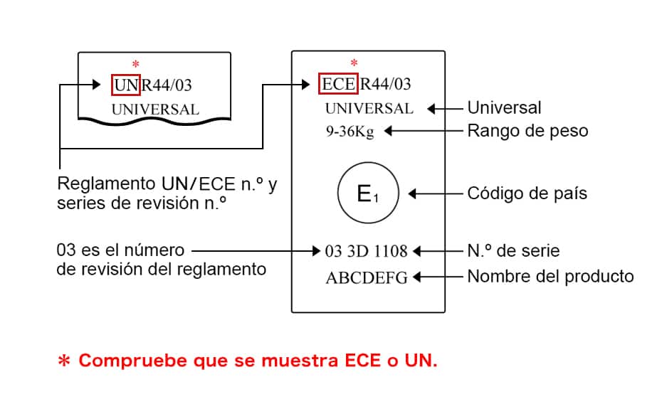 En la parte superior de la marca se encuentra el n.º de norma ECE y el n.º de serie de revisión