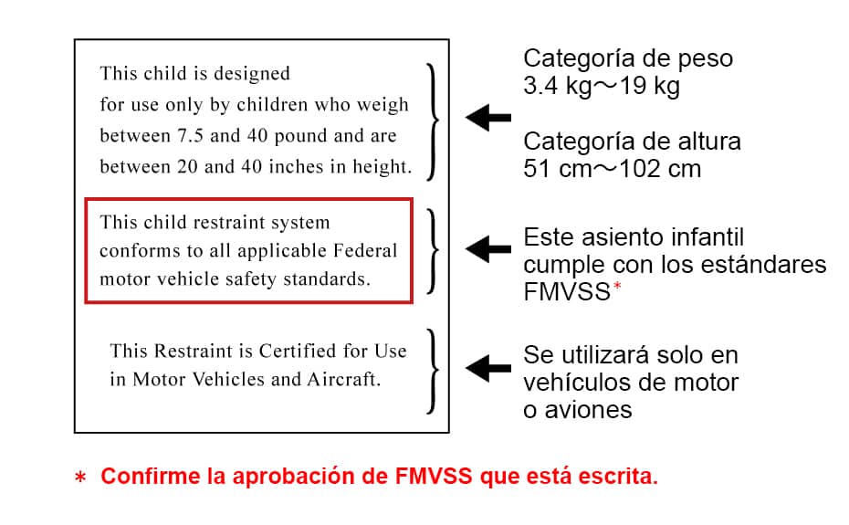 A continuación, se muestra la declaración de que este asiento para niños cumple con las normas FMVSS, seguida de la declaración de que el asiento solo se debe utilizar en vehículos motorizados o aviones.