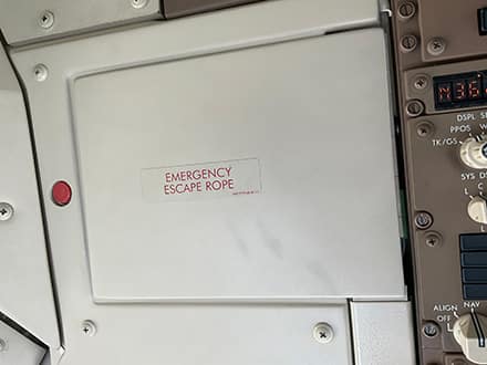 コクピットのドアを開けることができなくなった場合、パイロットは窓を開けて脱出します。地上からは非常に高い位置にあり飛び降りることはできないので、窓の上には脱出用ロープもあります。