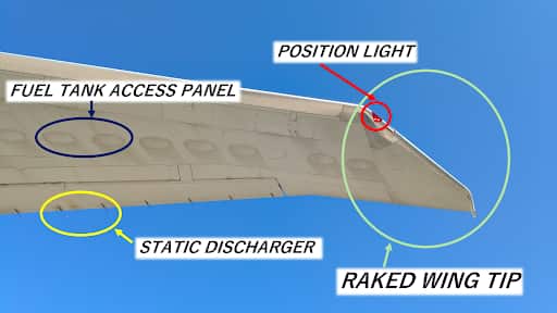 ボーイング777-300ER並びにボーイング777Fの主翼に装備されている、後方に尖った翼端形状のことです。翼端が空中を移動することで、翼端後方には翼端渦と呼ばれる一種の空気抵抗(誘導抗力)が発生します。レイクド・ウィングチップは、翼端を小さくすることで、翼端付近の空気の流れを整流し、翼端渦と空気抵抗を減らすことにより、燃費を向上させる効果があります。長距離を飛ぶ機体には必要な装備です。これは、ボーイング787でも採用されています。