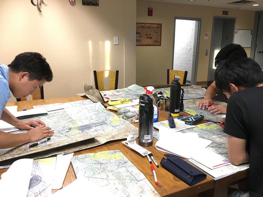 その後はNavigationと呼ばれる、街や山などの目標物を目印にしながら目的地の空港まで飛行する訓練を実施します。パイロット用の地図に線を引き、また上空の風の向きや強さを参考に事前に飛行する針路を計算して準備することが必要です。