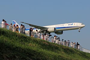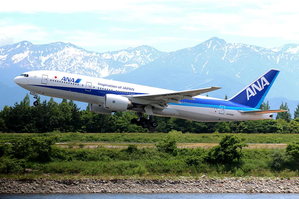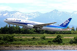 富山空港でかつて活躍したボーイング777-200ER(神通川土手)