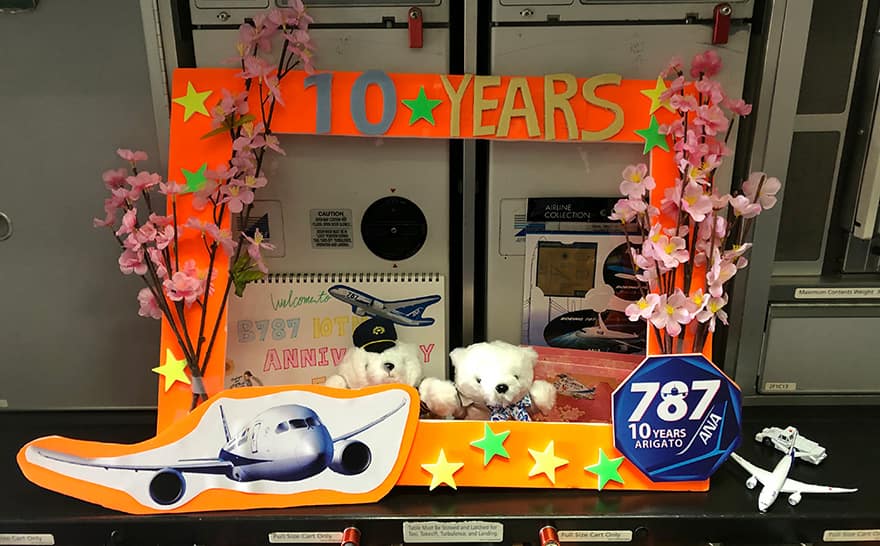 機内には、客室乗務員が作成した記念のディスプレイがされ、フォトスポットに。この便を担当する客室乗務員はボーイング787の導入年度に入社したクルーで編成されていることがアナウンスされると、客席からも拍手が起こりました。