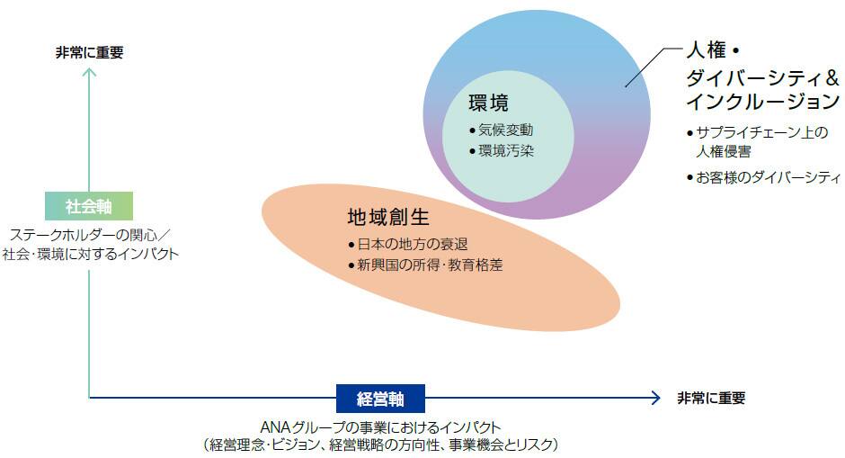 当社グループは、2020年度から新型コロナウイルス感染症の影響や予測不能の環境変化が続く中、社員一人ひとりのモチベーションや自律性の高さにより工夫を凝らし、会社の危機をグループ一丸となり乗り越えてきました。この「人の力」と「組織の力」を生み出す源泉である人的資本への投資を強化することにより、多様な人財が個々の強みを発揮しながら変革 を推進することが中長期的に会社の持続的な成長を支えていくと捉え、従前からANAグループの価値創造の基盤であった 「人財」を追加し、「環境」「人(人財・DEI・人権)」「地域創生」を当社グループの重要課題として特定しました。(図5)