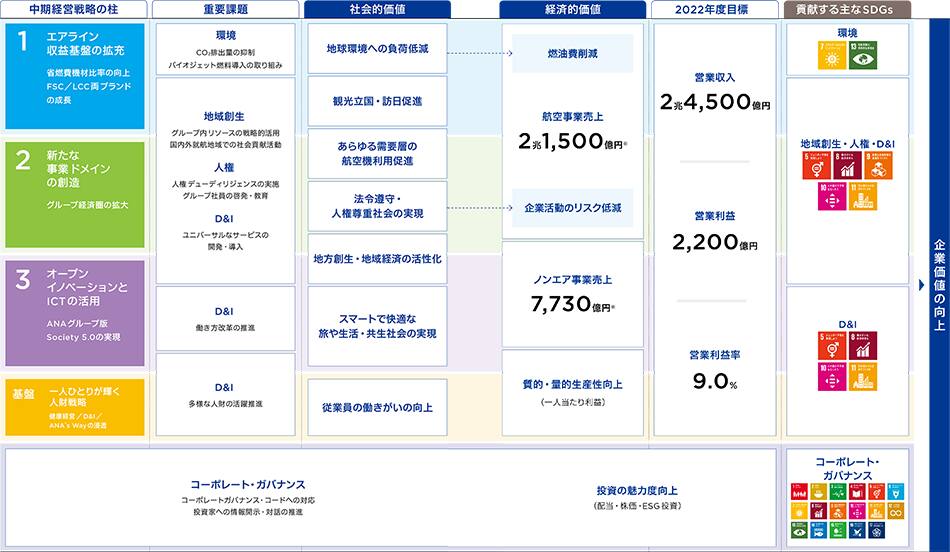 ANAグループは、「ワクワクで満たされる世界を」を、経営ビジョンに掲げ、グローバルな課題をANAグループらしい方法で解決することで、社会と共に発展する企業でありたいと考えています。グループとして取り組むべき重要課題を特定し、事業戦略・計画に組み込むことで、その解決に取り組んでいます。