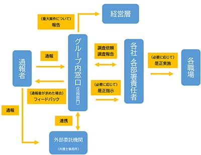 グループ全体のコンプライアンス体制の強化を目的として、当社法務部門と各グループ会社との連絡窓口を明確化し、双方向でコミュニケーションを取りやすい体制を構築・運用しています。
