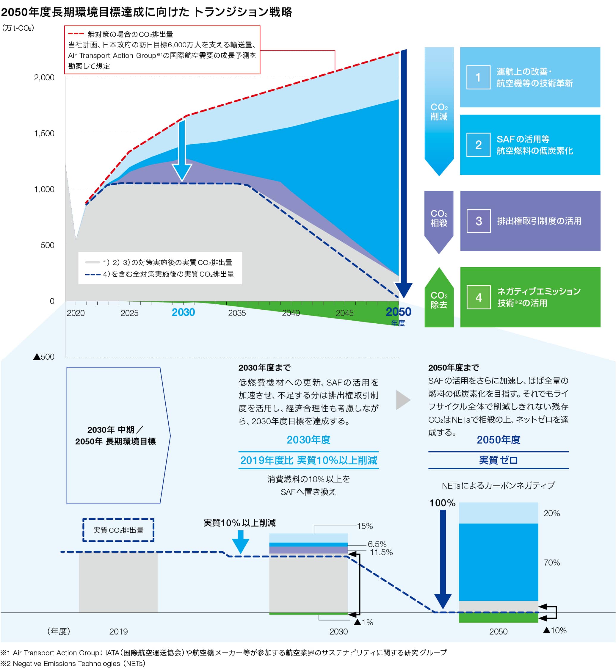ANAグループは、2030年度の中期環境目標および脱炭素社会の実現に向けたトランジション戦略を見直し、2050年度までのカーボンニュートラルへ向けたトランジション・シナリオを更新しました。2030年度までに、国際線・国内線合わせてCO2排出量を2019年度比で実質10%以上削減していきます。目標達成のため、SAFの活用を中核とする4つの戦略的アプローチ(運航上の改善・航空機等の技術革新、SAFの活用等航空燃料の低炭素化、排出権取引制度の活用、ネガティブエミッション技術*1の活用)を組み合わせ、経済合理性との両立も追求しながら、2050年カーボンニュートラルを実現してまいります。