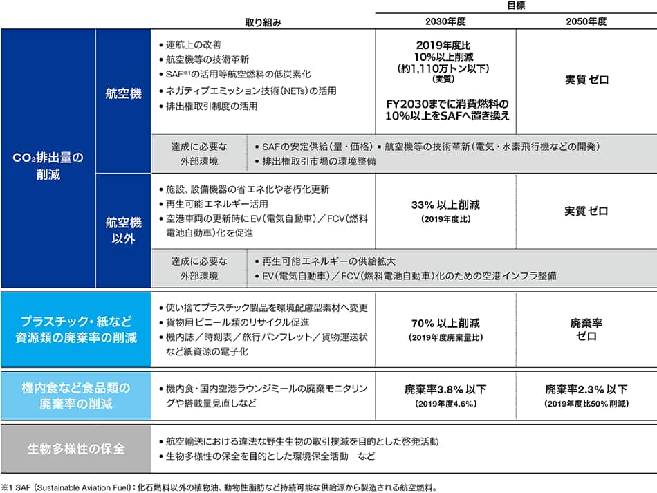 | 航空機の運航で発生するCO2排出量 | 2019年度比10%以上削減(実質) (約1,110万トン以下) |