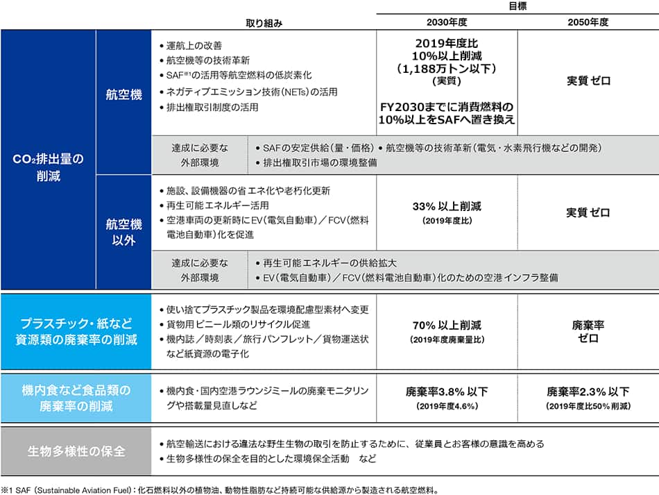 | 航空機の運航で発生するCO2排出量 | 2019年度比10%以上削減(実質) (約1,188万トン以下) |