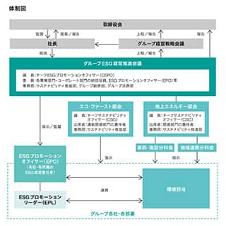 グループ各社においては、ESGプロモーションオフィサー(EPO)を推進責任者、ESGプロモーションリーダー(EPL)を推進実行者として、リスクマネジメント体制を構築しています。