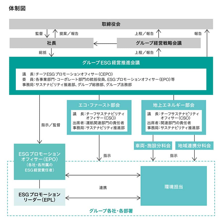 「環境」はANAグループが特定する重要課題の一つであり、気候変動を含む環境課題への対応については、ANAホールディングス株式会社代表取締役社長を総括、ESG経営推進の最高責任者であるチーフESGプロモーションオフィサー(CEPO)を議長とし、当社およびグループ会社の取締役・執行役員、ならびに当社常勤監査役を委員とする「グループ ESG経営推進会議」を設置し、気候変動を含む環境課題にかかわる重要方針や施策についての議論、目標に対する進捗のモニタリングを年4回行っています。また同会議の傘下には、CO2削減策や取り組み、進捗状況を報告、議論する「エコ・ファースト部会」(航空機の運航関連)、「地上エネルギー部会」(航空機以外の地上関連)を設置しています。経営戦略にかかわる重要な環境課題は「グループ経営戦略会議」にて議論、審議し「取締役会」に上程しています。取締役会は、気候変動課題を含むグループ全体の経営方針や目標を定めつつ、当社グループ各社の経営および業務執行を監督する役割を担っています。