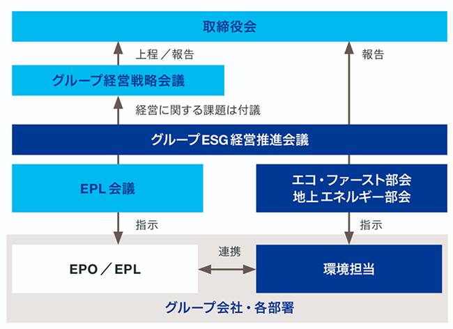 グループ各社にESG経営推進の責任者およびグループESG経営推進会議のメンバーとしてESGプロモーションオフィサー(EPO)、組織のESG経営推進の牽引役としてグループ各社・各部署にESGプロモーションリーダー(EPL)を配置し、取締役会、グループ経営戦略会議、グループESG経営推進会議で議論・決議・報告された事項は、EPOならびにEPLとの密接な連携のもとにグループ全体で共有、実践されます。EPLに対しても、年2回のEPL会議を通じて、包括的に情報を共有するとともにグループ各社・各部署における取り組みの促進につなげています。