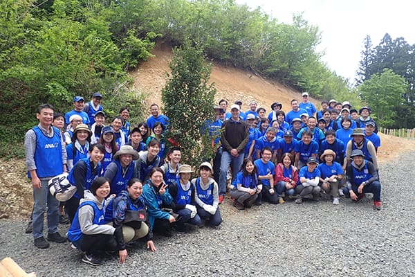 ANAグループでは、2012年7月より東日本大震災の復興支援と環境保全を目的とした「ANAこころの森プロジェクト」を宮城県南三陸町で実施しています。このプロジェクトでは、全国のANAグループ社員が南三陸町の「ANAこころの森」で、間伐作業や林道整備などのボランティア活動を行っています。
